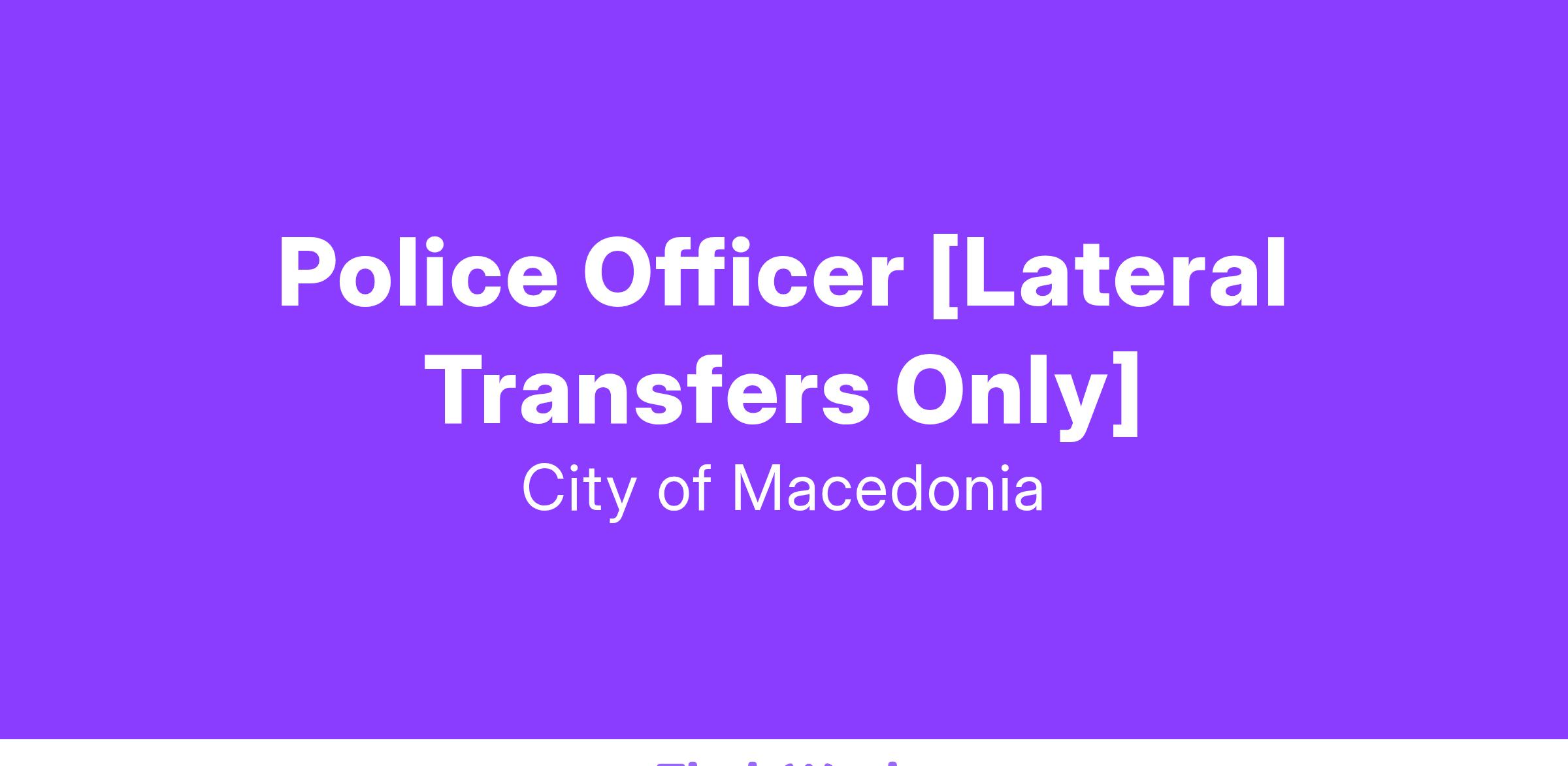 Applications Available: In person at Macedonia City Center - Police Dispatch (24 hours/day, 7 days/week), located at 9691 Valley View Road, Macedonia, Ohio 44056; The City will accept completed applications for lateral transfers for the position of Police Officer via email at (jhoover@macedonia.oh.us), U.S. mail, or hand-delivery effective immediately until position(s) are filled, or the City closes the application period. Duties: Perform all duties of the position of Police Officer, including but not limited to: enforce traffic violations, make arrests, collect and preserve evidence, administer first aid, testify in court, and promote good public relations. Applicants must be willing to work scheduled/assigned shifts (currently 12-hour shifts), including weekends and holidays. (shift differential per hour: Night shift $1.50, Float $.50 - subject to collective bargaining agreement) Salary Range: Subject to collective bargaining agreement, currently (2023) $67,390.79 - $78,568 depending on prior experience (2024) $69,412.52- $80,925.70, (2025) $71,494.90-$83,353.47. Other benefits: hospitalization, dental & vision insurance, prescription coverage, paid vacation time, 15 sick days per year, 13 holidays per year, uniform allowance. Accrued time may be transferred. Minimum Qualifications: Applicants must be currently or with in the past 12 months been employed as a full-time Classified Civil Service Police Officer. Eligible candidate(s) are required to take and pass psychological, physical and polygraph tests. Other testing includes EKG, drug screening (periodic drug screening during employment required) background check and personal interview with the appointing authority. Eligible candidate(s) required to be a nonsmoker and remain a non-smoker for duration of employment. Subject to probationary period. By order of the Macedonia Civil Service Commission / Equal Opportunity Employer