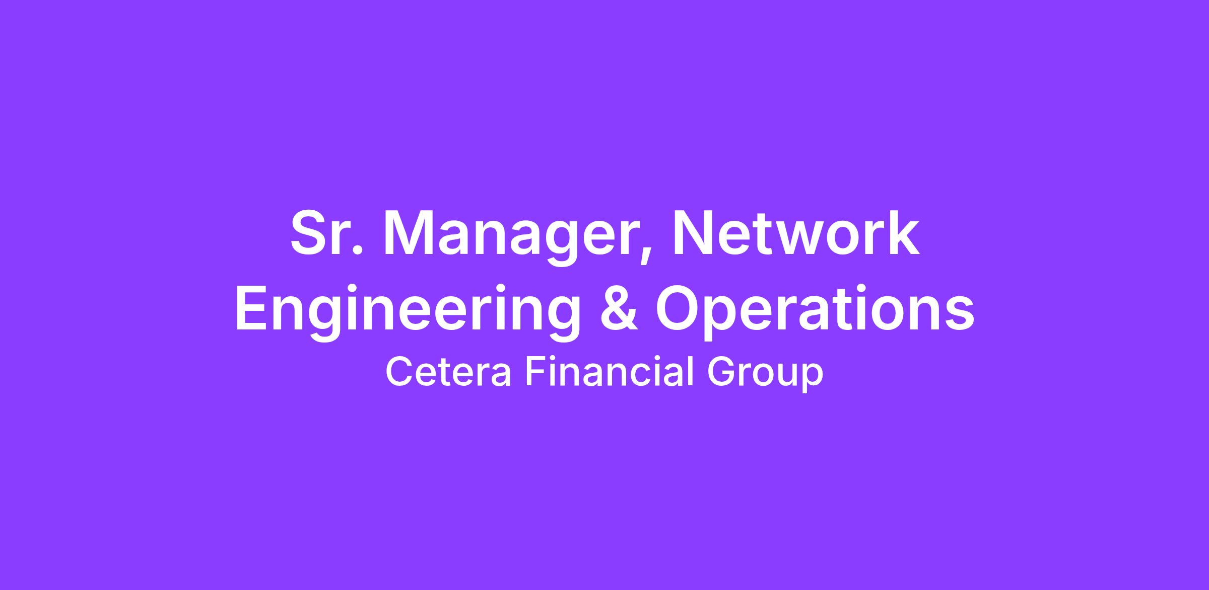 Cetera Financial Group is currently seeking a Sr. Manager Network Engineering & Operations for our company’s office located in either Dallas, San Diego or El Segundo. This is a unique opportunity to be a part of our world class Infrastructure team to run our Enterprise Environment, stay in touch with latest technology and provide world class customer service to internal and external clients.