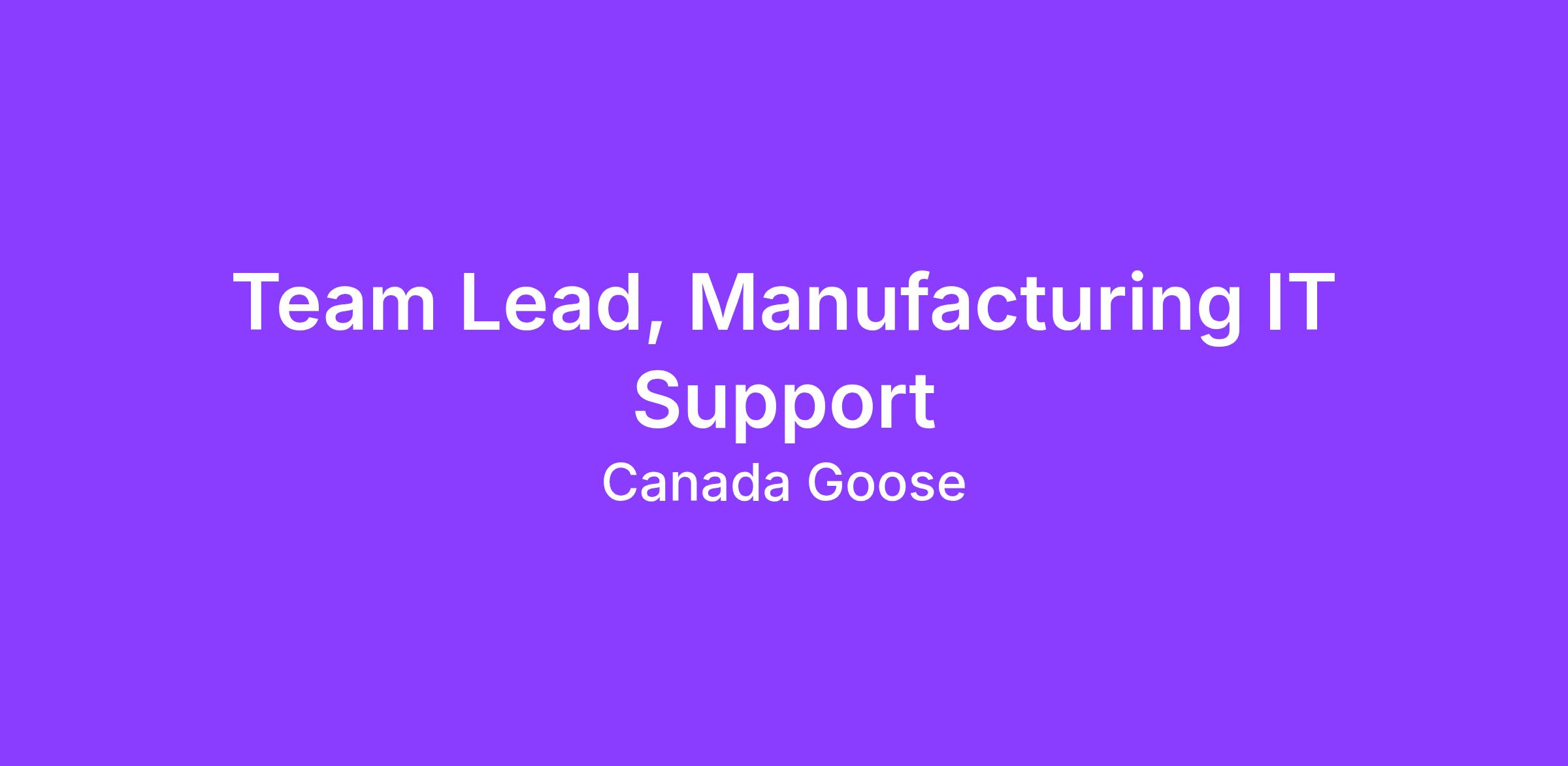 Team Lead, Manufacturing IT SupportCanada Goose isn't like anything else. We've built something great, something special - an iconic lifestyle brand with an inspirational and authentic story. At the heart of it is our promise to inspire and enable all people to thrive in the world outside. To Live in the Open. At Canada Goose, you're part of a movement that belongs to something bigger. One that seeks out the restorative power of nature and is driven by a purpose to keep the planet cold and the people on it warm. We endure any condition, observe every detail, and are building a community that believes in living bravely and coming together to support game-changing people.